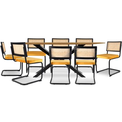 Pack Industriële Houten Tafel (220cm) & 8 Rotan en Fluwelen Gaas Stoelen - Wanda
