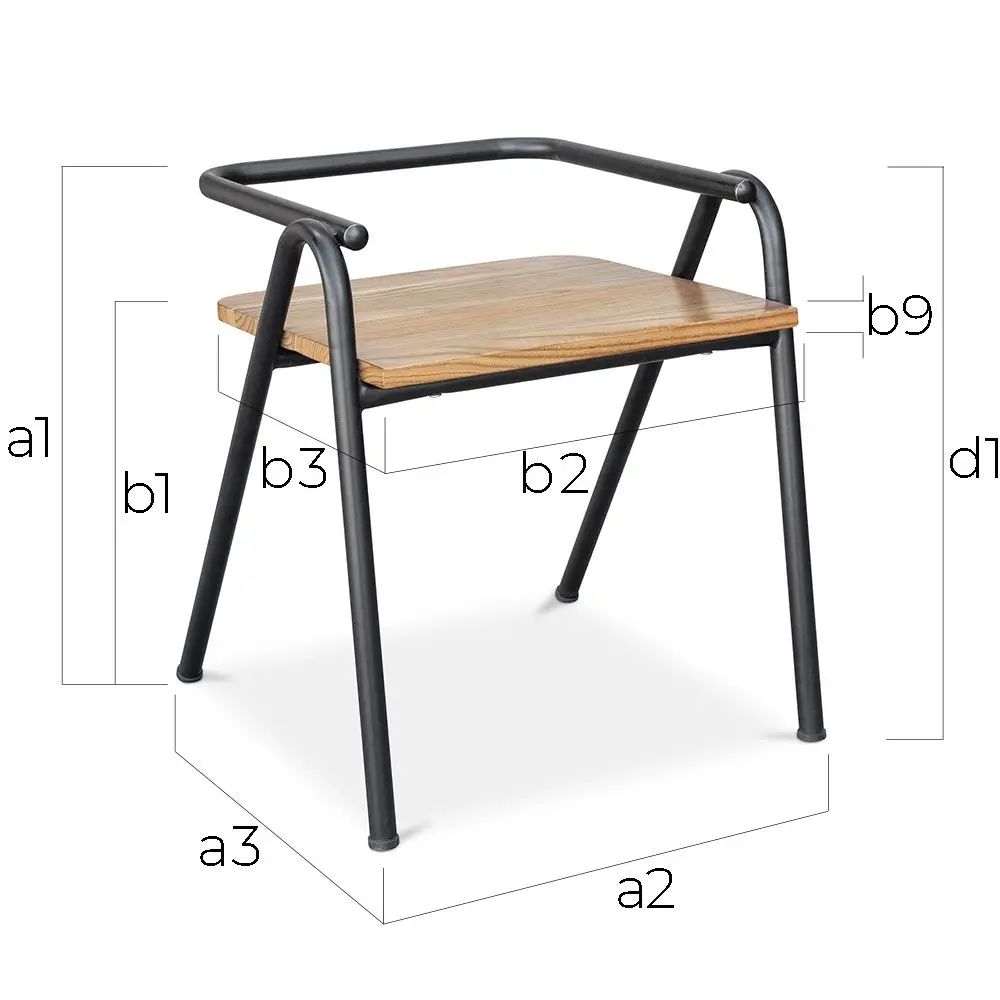 Dit is een stevige stoel van ijzer en hout met een kort en solide frame. Het massieve hout dat gebruikt wordt, zorgt ervoor dat mensen van alle maten comfortabel op de stoel kunnen zitten.