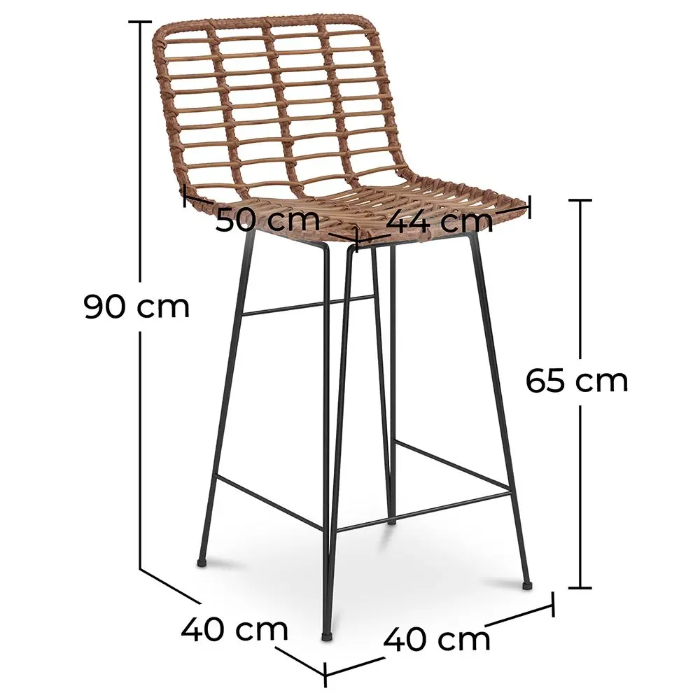 De zitting en rugleuning zijn uit één stuk geweven in rotan stijl. De vierpotige basis helt iets naar buiten voor betere stabiliteit. De krukzitting is 65 cm hoog, wat betekent dat het kan worden gebruikt als keukenmeubel of aan een bar. Deze boho barkruk is gemakkelijk schoon te maken en een symbool van een zorgeloze maar stijlvolle levensstijl.