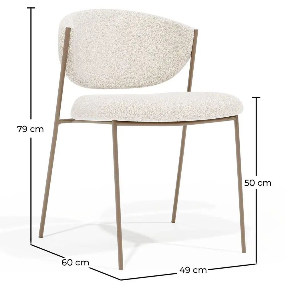 De eetkamerstoel met bouclé stoffen bekleding en een metalen structuur in champagnekleur is een elegant en veelzijdig meubelstuk dat perfect stijl en functionaliteit combineert. De bouclé stoffen bekleding geeft het een getextureerde en verfijnde uitstraling, met een vleugje warmte en comfort. De metalen constructie zorgt voor uitzonderlijke duurzaamheid, waardoor het een ideale keuze is voor hotels, restaurants en residentieel gebruik. De omhullende rugleuning van de stoel biedt ergonomische en comfortabele ondersteuning, waardoor deze designstoel perfect is voor hotels en restaurants.