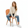 Denne spisestolen er mye mer enn bare en sitteplass; det er en stiluttalelse. Enten det er ved et tradisjonelt spisebord eller i en mer moderne setting, integrerer denne stolen seg sømløst og tilfører en touch av nordisk forfining. Denne stolen er polstret i mykt og luksuriøst fløyel, noe som tilfører en touch av sofistikasjon til rommet ditt, enten det er hjemme eller på et luksushotell, en designerrestaurant eller et venterom. Metallbenene med sin naturlige tre-look-finish gir stolen et varmt og jordnært element, som harmonisk kontrasterer med fløyelen og skaper en balansert estetikk.