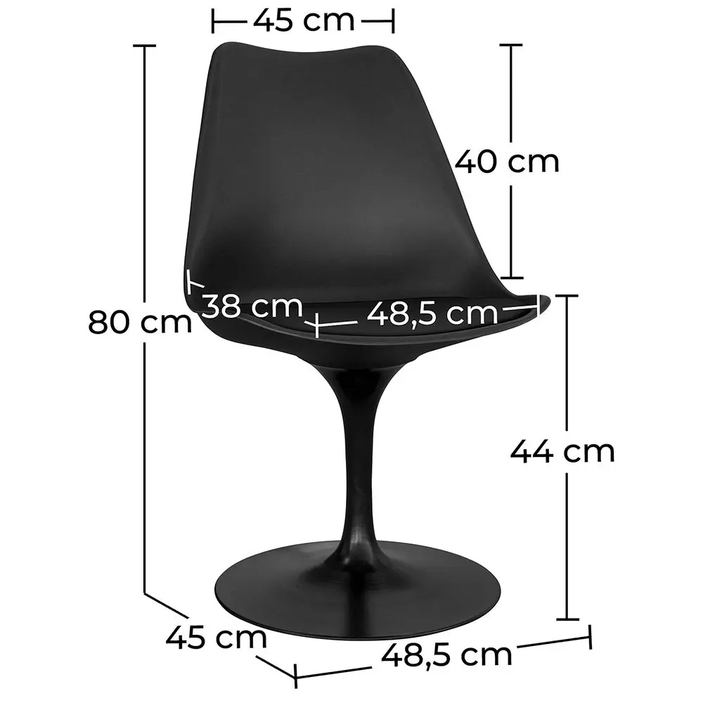 Wij presenteren u de mythische zwarte Tulipan stoel in een goedkopere uitvoering maar met dezelfde hoge kwaliteit als altijd. Deze draaistoel is gemaakt met een PP-zitting en een massief stalen poot die in het zwart is gelakt. Het kussen is bekleed met kunstleer en het zachte schuim zorgt voor veel comfort. De duurzame zwarte Tulipan stoel zal ideaal staan in elke stijl woonkamer.