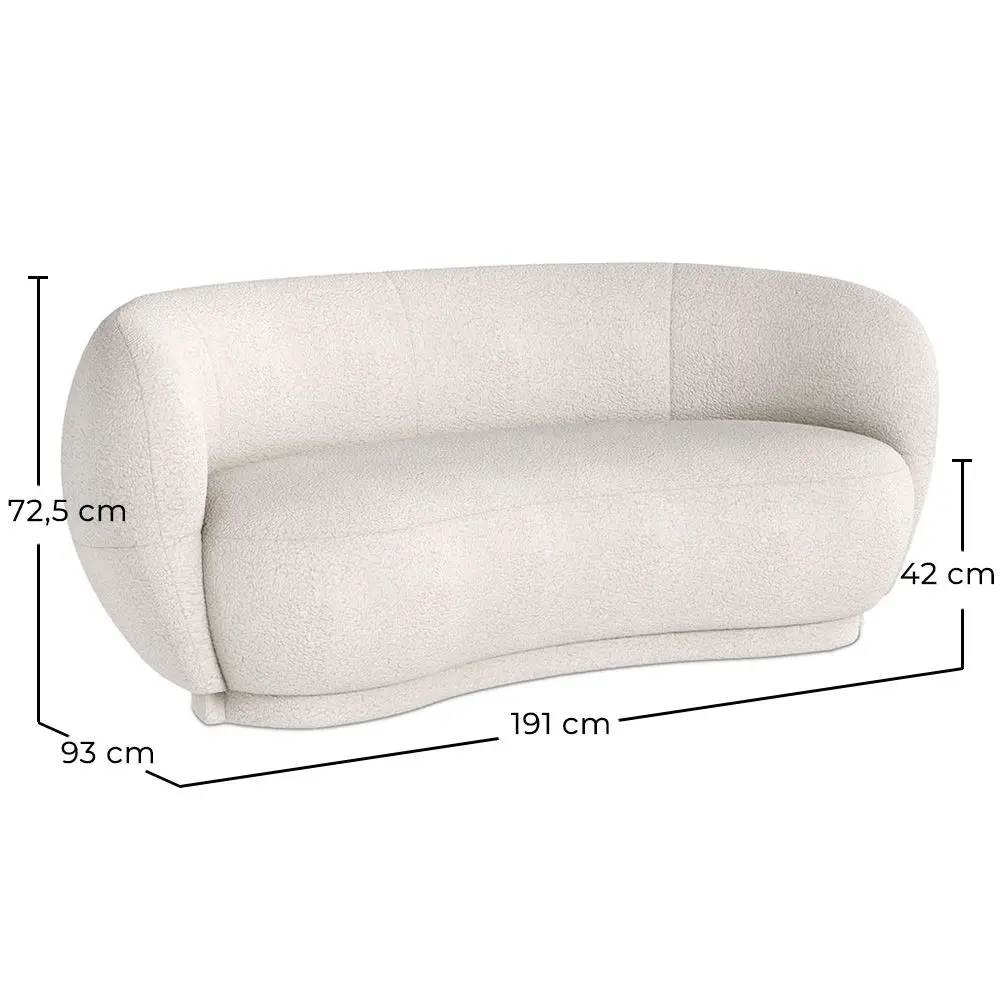 Minimalisme neemt de overhand bij deze 3-zits gebogen sofa met bouclé bekleding in een charmante off-white kleur. Doordat de poten verborgen zijn, lijkt de sofa in de lucht te zweven! Je woonkamer wordt radicaal modern als je kiest voor deze gebogen sofa, aangezien bouclé stof bekleding en organisch gevormde meubels twee van de sterkste decoratie trends zijn. Deze gebogen design sofa is perfect als je een elegante touch wilt toevoegen aan je huis of commerciële ruimte zoals een hotel, restaurant, of wachtruimte...