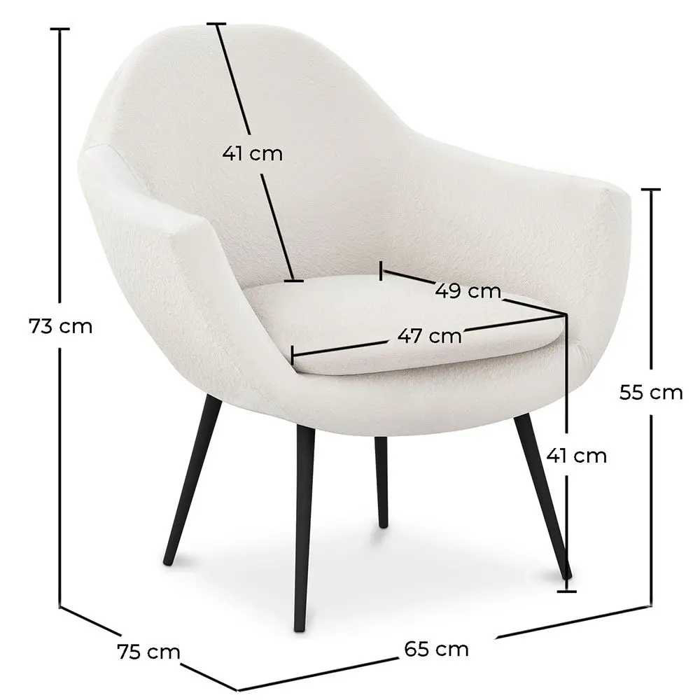 We houden van deze stijlvolle, klassieke en moderne fauteuil met een randje. Het heeft metalen poten met zwarte afwerking en witte teddy-fleece bekleding. Wat comfort betreft, wordt het zitvlak geleverd met een kussen en de rugleuning is schuin. De stijl van deze fauteuil zal elke kamer opvrolijken.