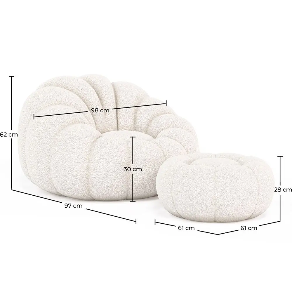 De Calera fauteuil met voetensteun, biedt je naast een comfortabele zitplaats ook een decoratief stuk, aangezien de bouclé bekleding een must-have is voor elke interieurontwerp liefhebber.