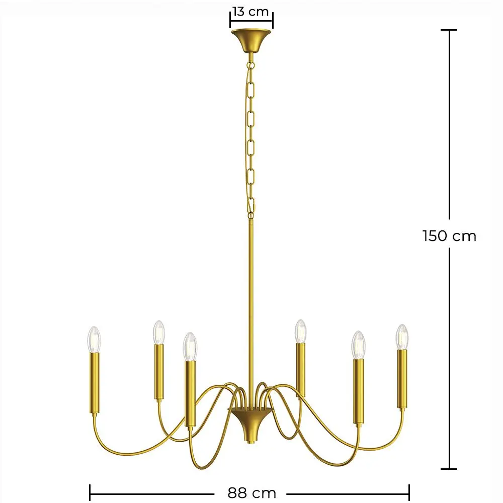 Verrijk je interieur met deze elegante hanglamp in satijn goud, ontworpen om te schitteren in eetkamers, woonkamers, hallen of ruimtes met hoge plafonds. Geïnspireerd door klassieke kroonluchters, combineert deze lamp met 6 gebogen armen traditionele charme met een verfijnde, eigentijdse uitstraling.