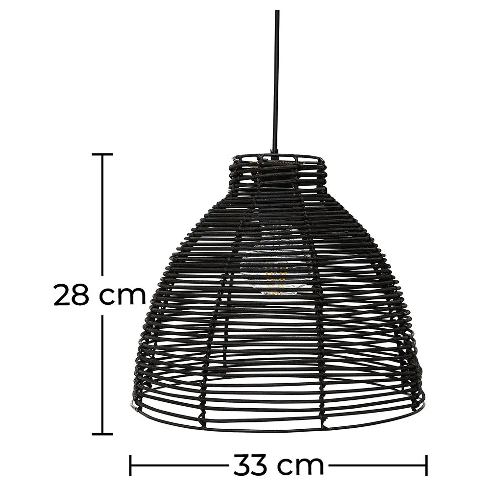 Gemaakt van een rotan en geschilderd in zwart, brengt onze lampenkap het buitenleven naar binnen, of naar uw patio. Zwarte kleur geeft een stijlvolle en schemerige uitstraling van deze handgemaakte lamp van natuurlijk materiaal. Eenvoudig patroon van weven zal reflecteren rond de kamer. Geniet van het licht.