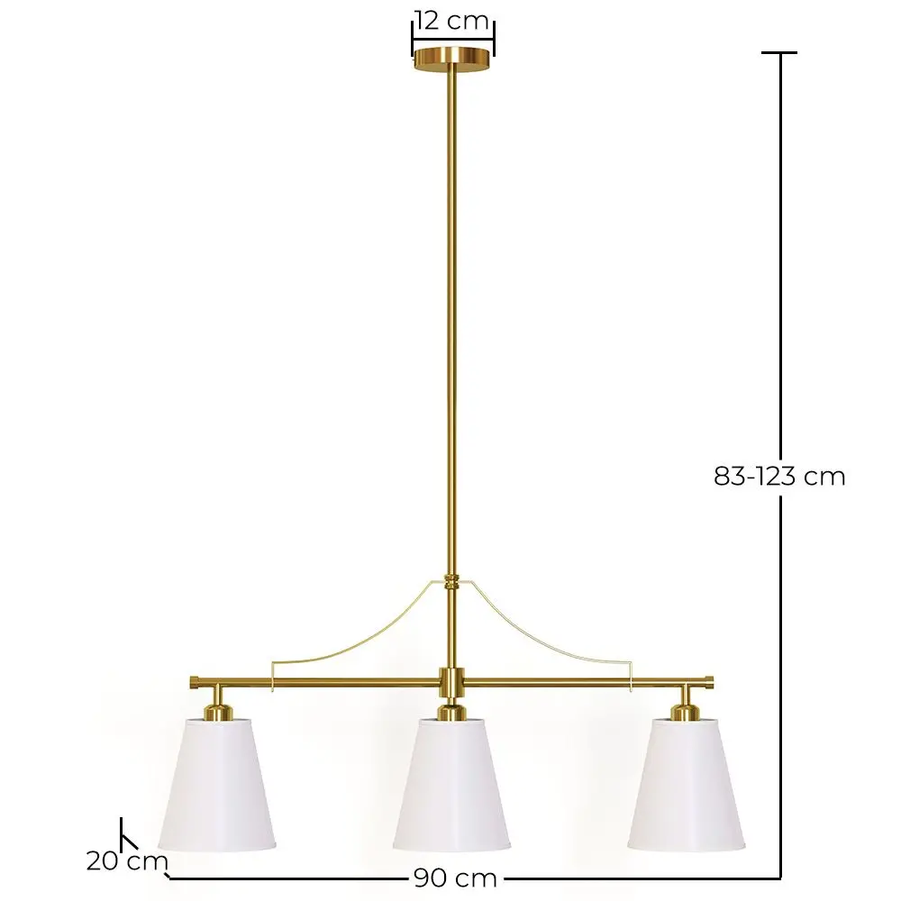 Breng elegantie en warmte in huis met deze hanglamp van metaal met oudgouden afwerking, een verfijnde lamp die klassiek design en moderne functionaliteit combineert. De lineaire structuur draagt drie witte stoffen kappen die het licht zacht en gezellig verspreiden, ideaal voor eetkamers, woonkamers of keukens.
