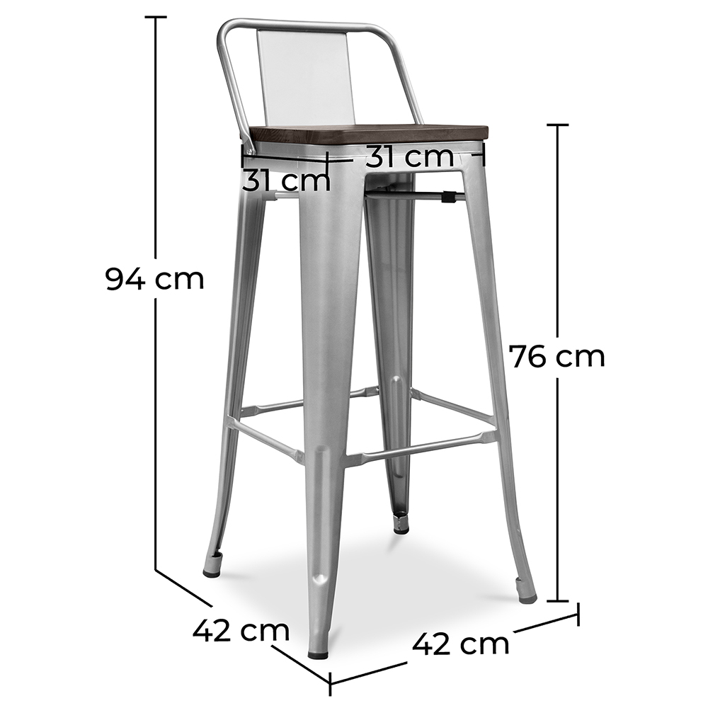 Geniet van de perfecte mix van comfort en stijl met de Metalix kruk met rugleuning en donker houten zitting. Met een zithoogte van 76 cm vanaf de vloer is het ideaal voor hoge bars, keukeneilanden of horecaruimtes die op zoek zijn naar een authentieke en verfijnde industriële uitstraling.
