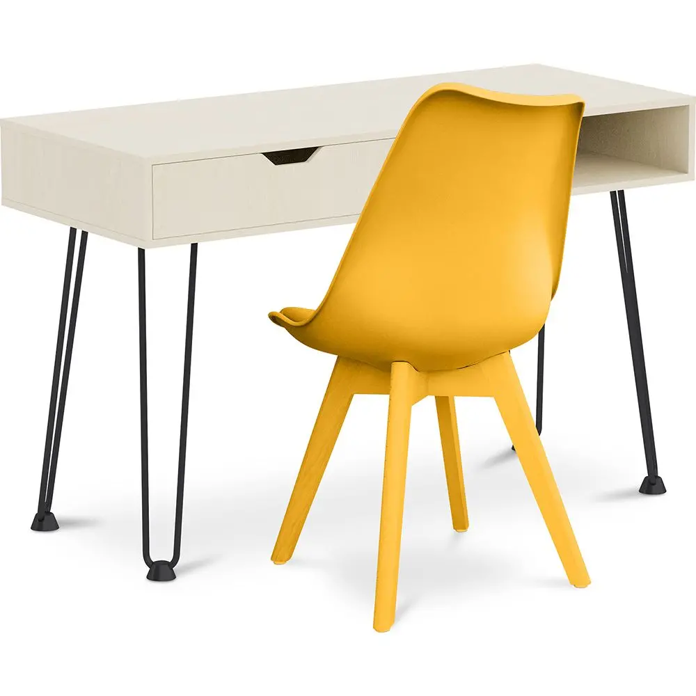 Creëer je perfecte werkomgeving. Dit is een thuiskantoor meubelsetaanbieding om naar te verlangen. Met een ruim houten Hakon bureau, opbergruimte en moderne hairpin poten, heb je zowel vorm als functie om je werk te ondersteunen. De set wordt geleverd in combinatie met een Brielle scandinavisch design stoel met een kussen.
