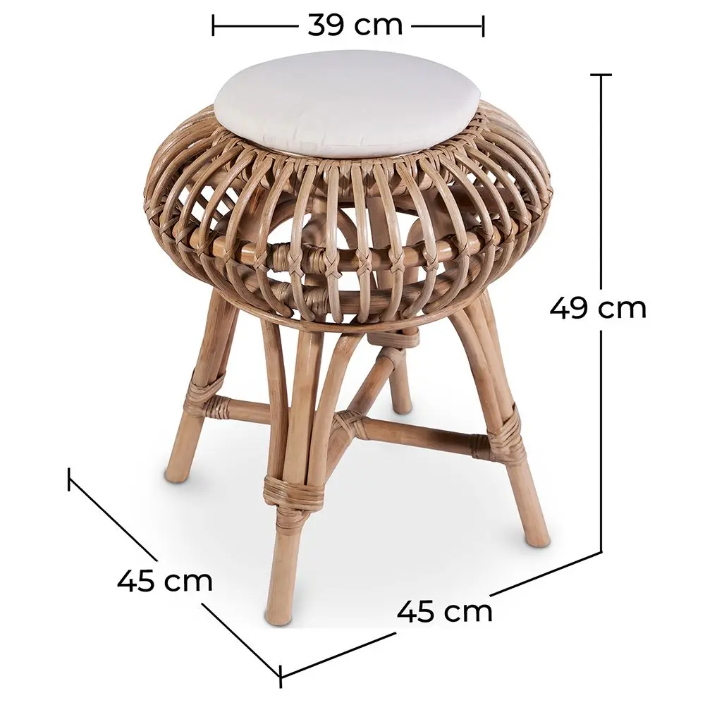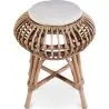 Zeg hallo tegen Yuva, onze rotan ronde kruk met een gestoffeerde zitting bekleed met canvas. Het is een decoratieve en duurzame kruk perfect voor buiten- en binnengebruik. Een originele vorm en natuurlijke materialen maken deze kruk perfect voor een tuin, balkon, patio, huis of commercieel gebruik.