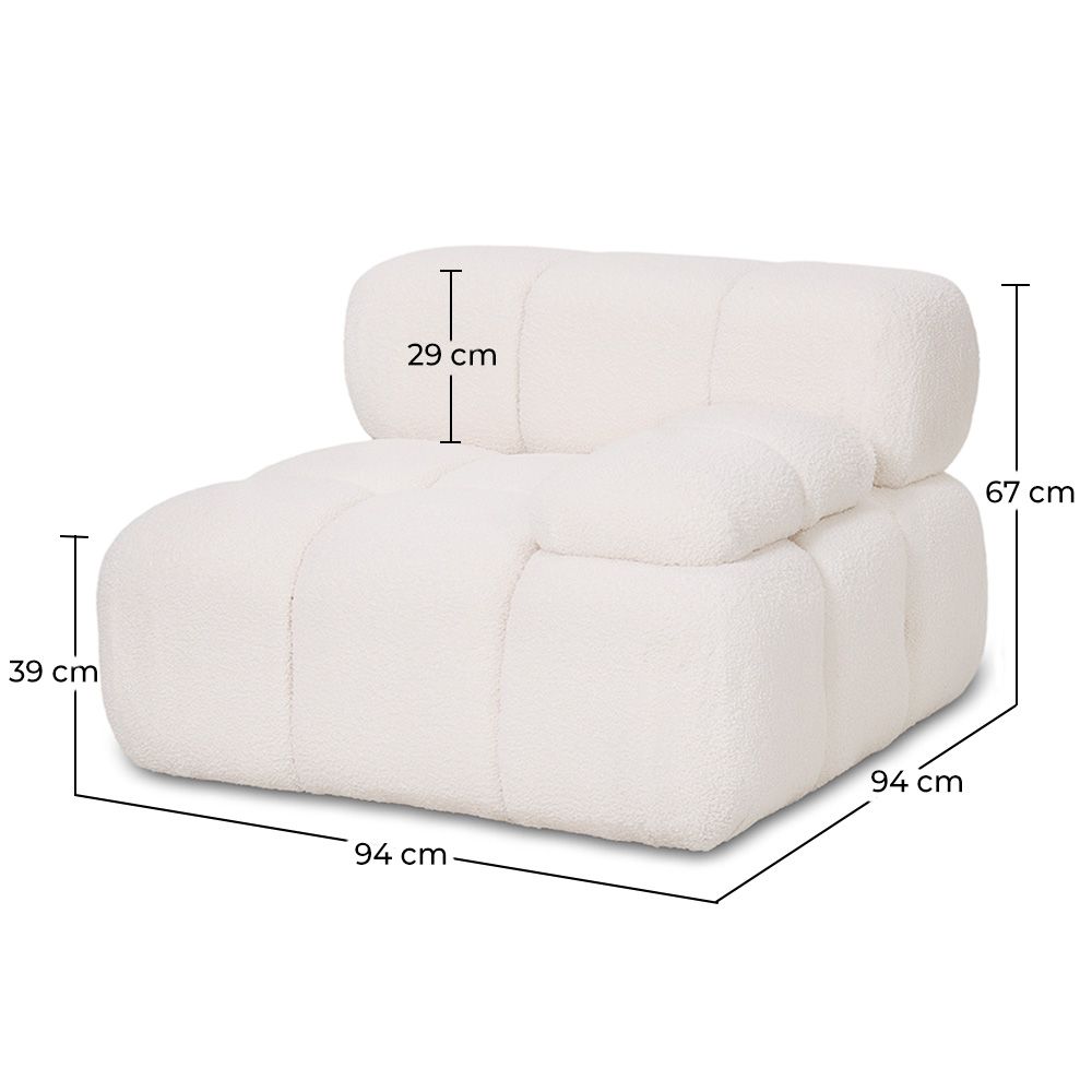 Geef je woonkamer een eigentijdse en gezellige uitstraling met deze modulaire hoekbank bekleed met witte bouclé stof. Het veelzijdige ontwerp stelt je in staat om het te combineren met andere modules om verschillende configuraties te creëren, aanpassend aan grote of kleine ruimtes volgens je behoeften.