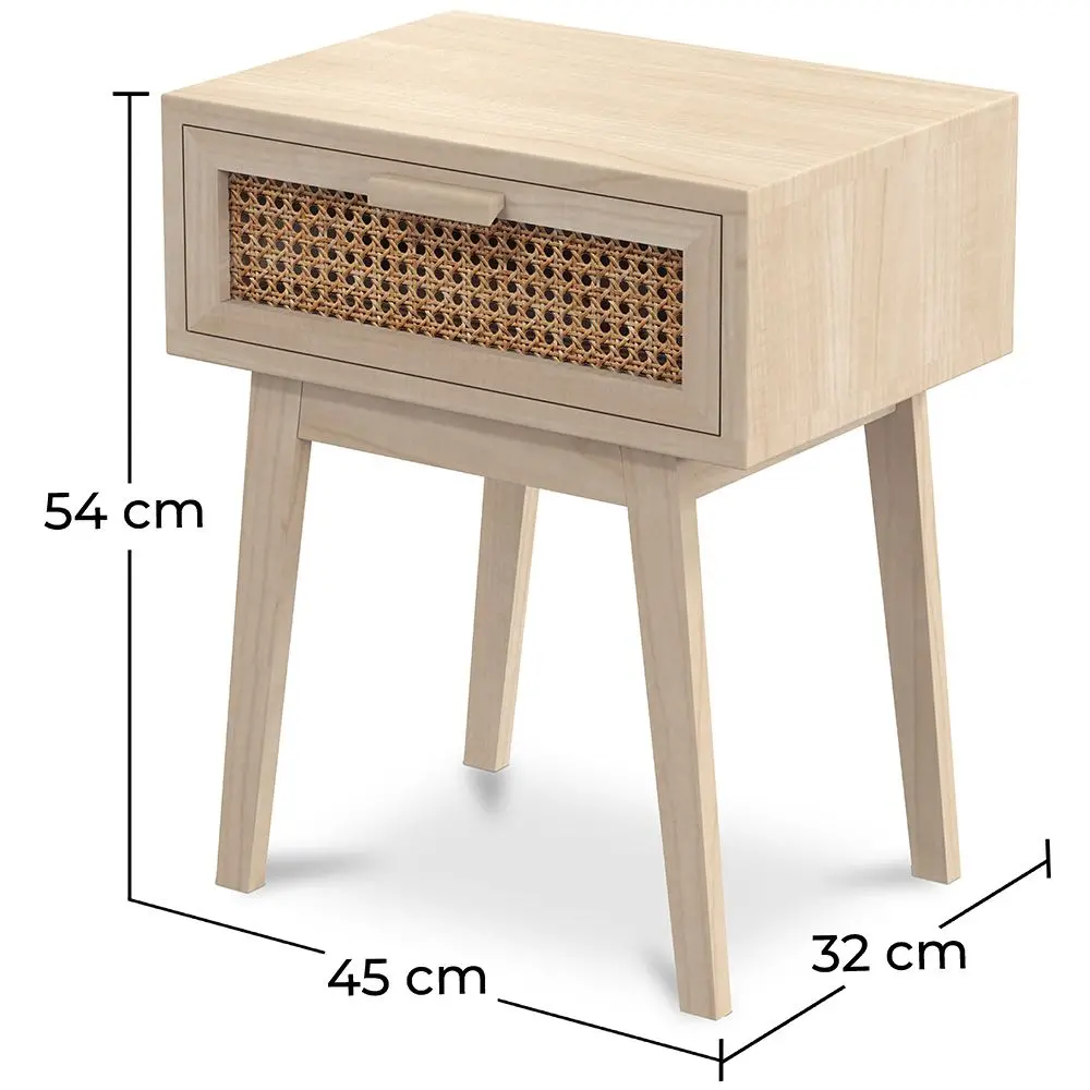 Dit ontwerp nachtkastje is ideaal voor slaapkamers thuis of in hotels. Houd je persoonlijke bezittingen binnen handbereik, zoals de tv-afstandsbediening, eBook of je mobiele telefoon dankzij de opbergruimte die wordt geboden door de lade met een gaasfront, die soepel opent en sluit dankzij de premium kwaliteit scharnieren. Het rotan met cannage ontwerp en de natuurlijke kleur van het hout van dit nachtkastje combineren perfect met elke decoratiestijl. Het cannage ontwerp is typisch voor de boho chic stijl en zal je slaapkamer een unieke touch geven.