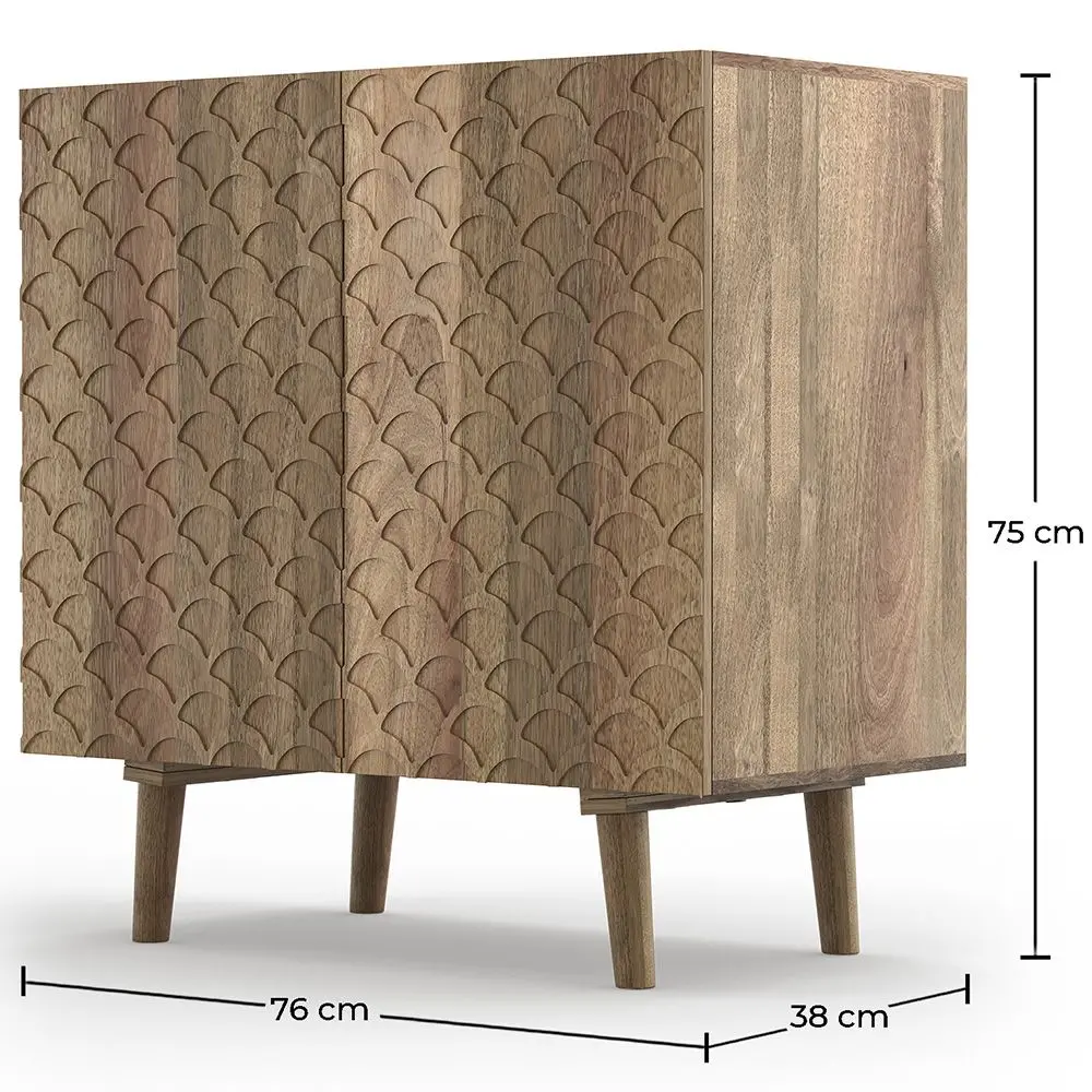 Mangohouten kast met vier vakken en decoratieve deuren waarachter u al uw spullen kunt verbergen. Het houten element zal warmte toevoegen aan uw woonkamer, of eetkamer.