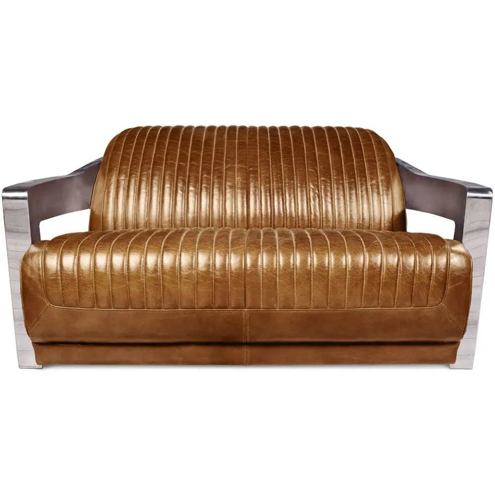 Deze 2-zits Design Bank van Churchill Lounge zal aan al uw behoeften voldoen. De bruine leren bekleding, symbool van elegantie, rust op een multiplex frame. De armleuningen daarentegen rusten op een roestvrijstalen frame. De combinatie van deze twee materialen creëert een unieke esthetiek die een mix is van charme en stevigheid. Het zal zich perfect aanpassen aan zowel een traditioneel als een meer eigentijds interieur. Dankzij de stalen armleuningen die direct aan de basis zijn bevestigd, kunt u er zeker van zijn dat deze fauteuil zeer duurzaam zal zijn.
