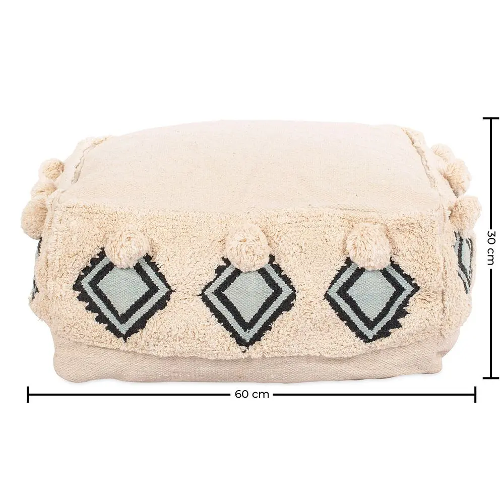 Iris is een ideale toevoeging aan elke woonruimte. Deze poef is gezellig, comfortabel, gemakkelijk te verplaatsen en trendy. Het komt in een kubusvorm, heeft thermocol korrels als vulling en katoenen stof. Het patroon in boho-stijl is speels en rustgevend. Perfect naast je bank als extra zitplaats of voetensteun.