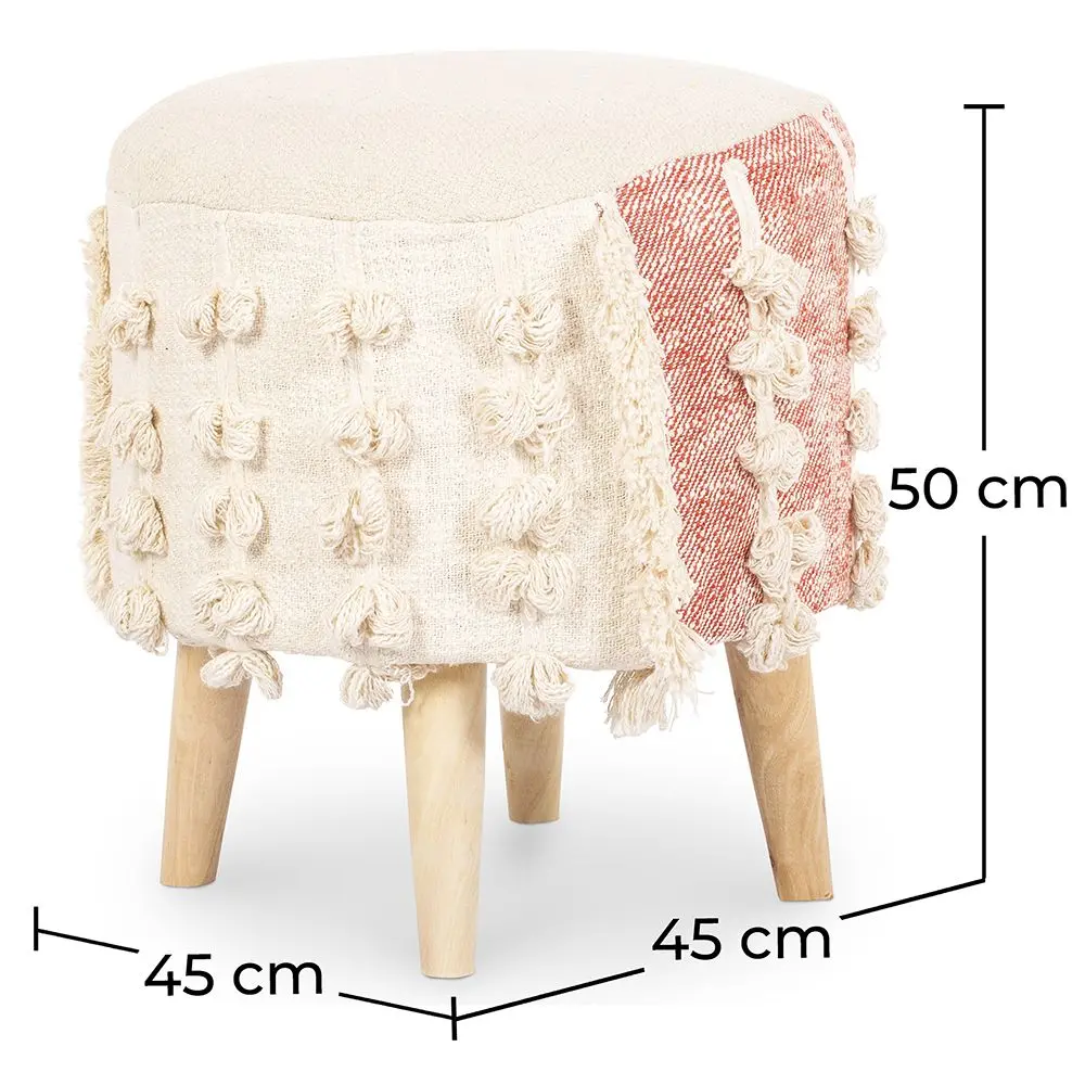 Vanessa is een lichte en kleine decoratieve kruk. Het staat op vier houten poten en is bekleed in een boho stijl mengsel van katoen. Het kan worden gebruikt als voetenbankje of als extra zitplaats. Voordelen? Gemakkelijk te verplaatsen, handgemaakt, decoratief en functioneel.