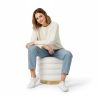 Geniet van maximaal comfort en stijl met onze ronde poef gestoffeerd in bouclé-stof die doet denken aan schapenwol. Met een houten structuur en een gouden basis combineert deze poef elegantie en moderniteit in een uniek design. De zachte en gezellige bekleding biedt een luxueuze zitervaring, terwijl het ronde design een eigentijdse uitstraling biedt. Perfect om een vleugje verfijning toe te voegen aan elke ruimte, is deze poef synoniem voor superieure kwaliteit en verfijnde stijl.