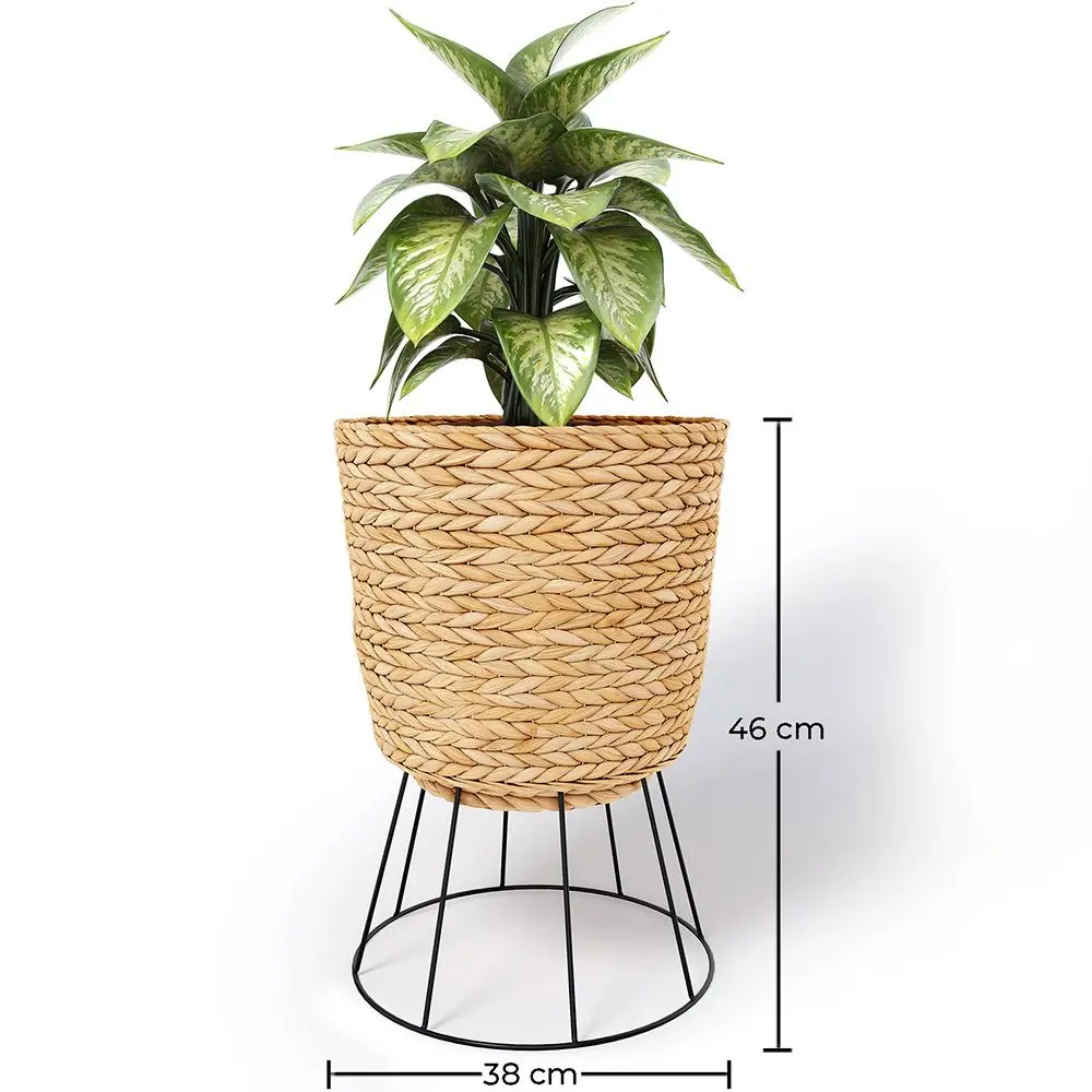 Ontdek de natuurlijke harmonie met deze betoverende ronde vloerplantenbak, vervaardigd met een weefsel van natuurlijk waterhyacint in de natuurlijke kleur en geaccentueerd door een zwarte metalen structuur, alles op een hoogte van 46 cm. De waterhyacint, behendig gevlochten rond de plantenbak, voegt een warme textuur en een gezellig gevoel toe, terwijl de zwarte metalen structuur duurzaamheid en een moderne touch garandeert. Met een hoogte van 46 cm wordt deze plantenbak het perfecte canvas om de schoonheid van je planten te accentueren, met een fusie van natuurlijke en eigentijdse stijl die de esthetiek van elke ruimte verhoogt.