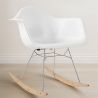 Eigentijdse schommelstoel met een duurzaam polypropyleen zitvlak, versterkte stalen poten en details van massief beukenhout. Perfect voor iedereen die op zoek is naar functioneel en esthetisch meubilair voor thuis of op kantoor. Door het ergonomische ontwerp is hij ook geschikt als borstvoedingsstoel, en biedt zowel ontspanning als stijl.