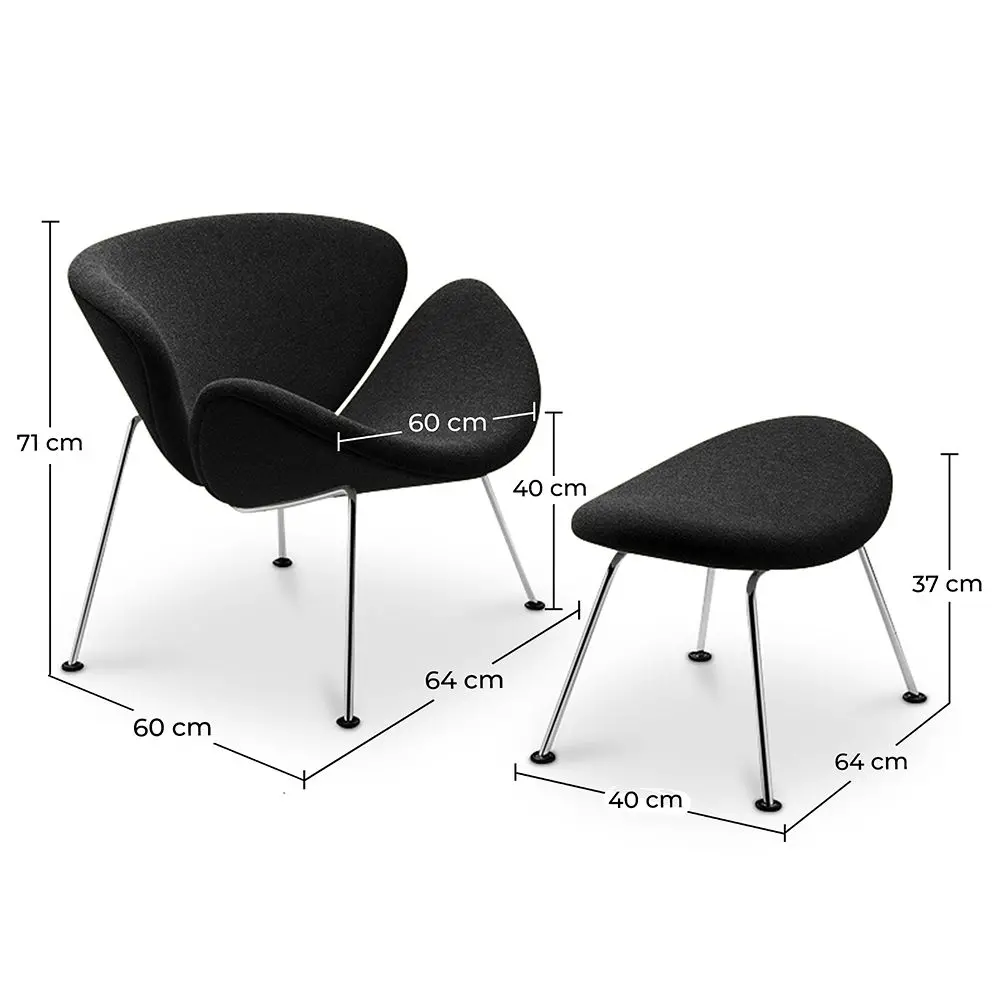 De zitting van de Slice Armchair is omsluitend, zacht en pluizig en opent als een bloem, uitnodigend om te ontspannen. De basis is van chroomstaal. De Orange Slice Armchair is verkrijgbaar in een breed scala aan bekleding en kleuren.