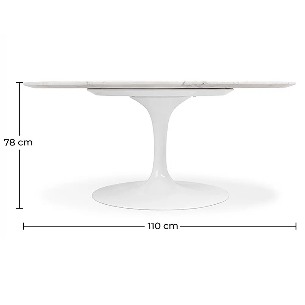 Gemaakt van marmer, deze ovale Tulipa Tafel -110 cm is onderdeel van de woonkamer meubel collectie samen met de Tulipa stoel en fauteuil, die een must-have zijn geworden in de wereld van hedendaags design. Zoals alle producten uit deze collectie, heeft dit model een uniek en centraal onderstel, wat stabiliteit, stevigheid en ruimte biedt. Het 110 cm blad zal je alle ruimte bieden die je wilt.