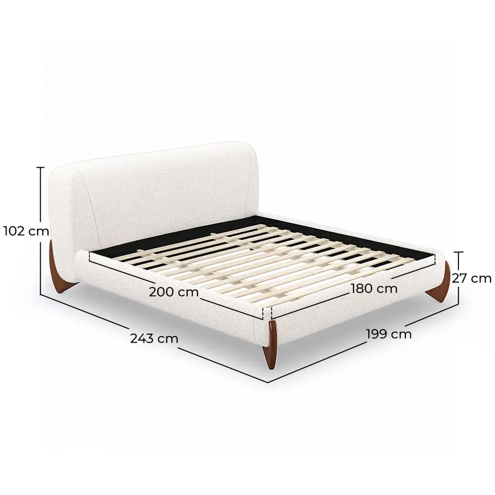Dit bed, ontworpen voor matrassen van 180x200 cm, combineert elegantie en functionaliteit met zijn houten frame bekleed met bouclé stof. De donkerbruine houten poten voegen een vleugje verfijning toe, terwijl het bedframe, bestaande uit twaalf MDF houten latten, zorgt voor een robuuste en duurzame ondersteuning. Het moderne en minimalistische ontwerp maakt het tot een perfect stuk om de slaapkamer een trendy uitstraling te geven. Ideaal voor wie op zoek is naar een balans tussen stijl en comfort, verandert dit bed elke ruimte in een gezellige en eigentijdse oase.
