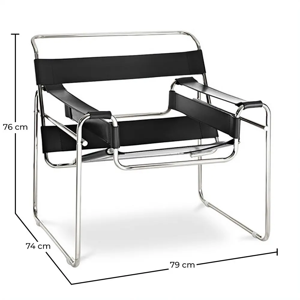 De Vasyl Chair is een waar structureel spel met stalen buizen dat symbolisch is voor het "minimum" dat een fauteuil zou moeten hebben. Deze fauteuil heeft minimalistische lijnen die alles zijn wat het nodig heeft om te bestaan: lijnen voor het frame en een leren bekleding om het lichaam van de zitter te ondersteunen. Dit model is in kunstleer. De zitting heeft een iets naar achteren gekantelde rugleuning om comfortabel zitten te garanderen. Deze woonkamerstoel zal uw gasten niet nalaten te verrassen met zijn uitgeklede eenvoudige stijl. Deze fauteuil kan zich aanpassen aan elke kamer in uw interieur: de woonkamer, keuken, eetkamer of kantoor. Nog beter, deze comfortabele stoel neemt zeer weinig ruimte in beslag en voegt een hedendaagse toets toe aan de rest van uw huis.